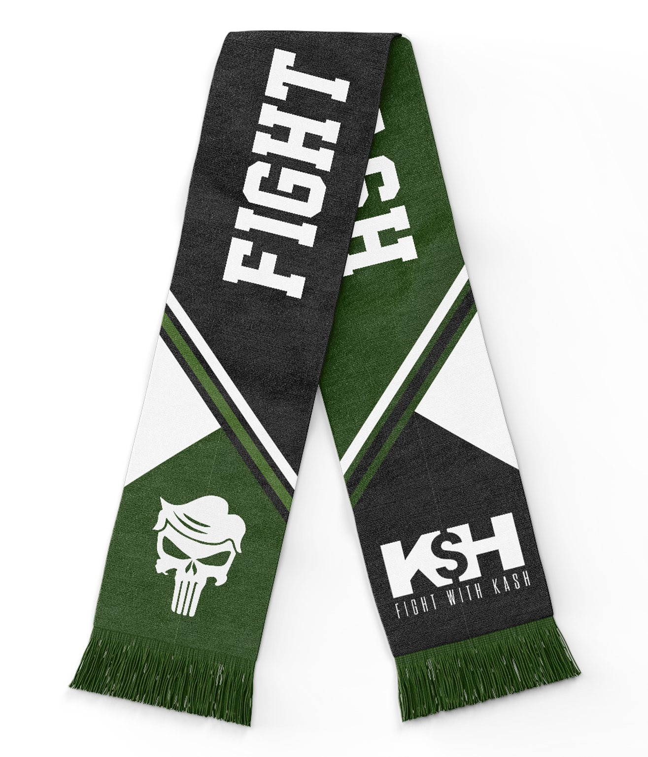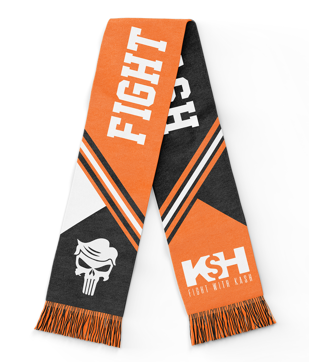 Made for the season, these reversible scarves feature “Fight with Kash”, the Kash logo, and our most-loved Orange Man Bad symbol. Available in a green combo and orange combo.