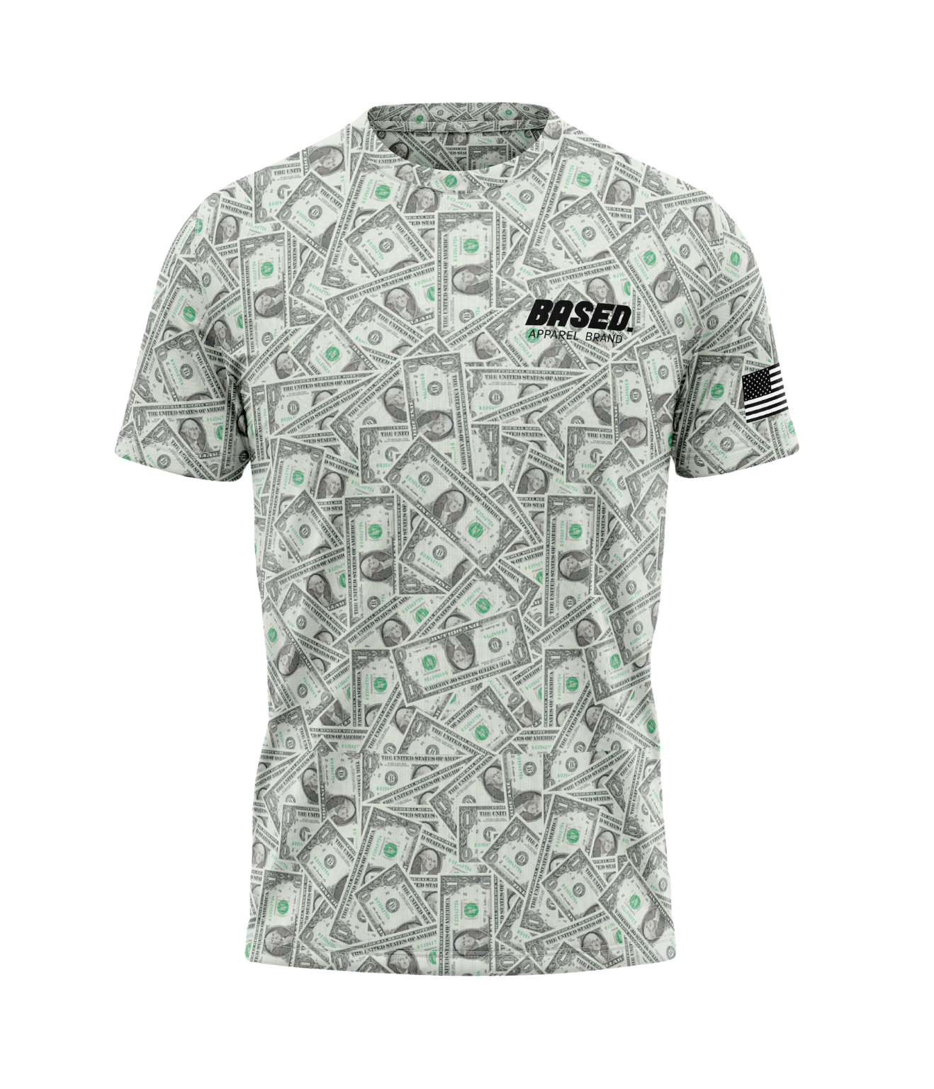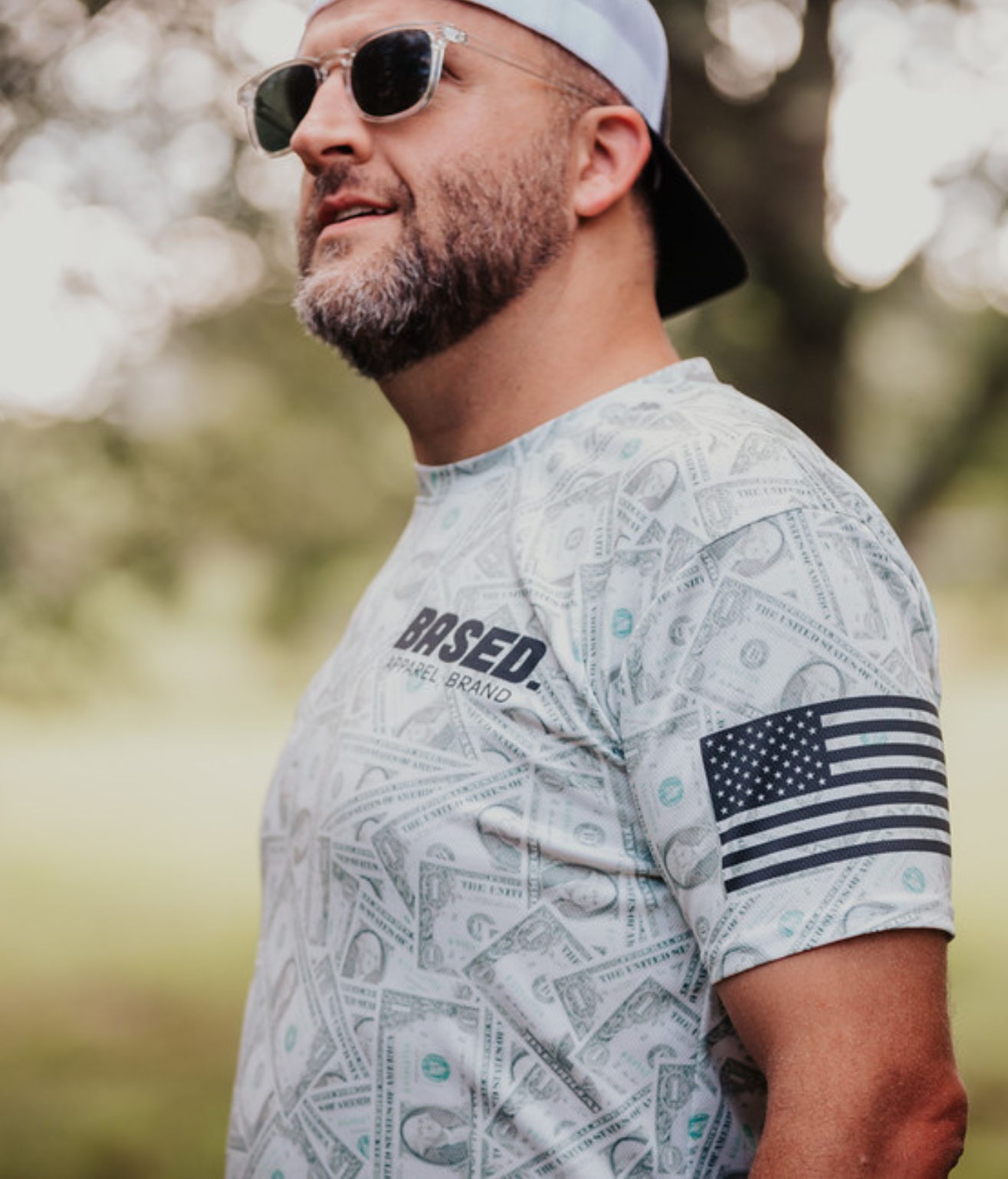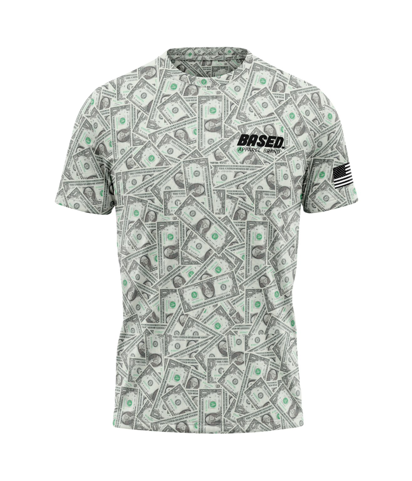 Make it rain in the George Dollar Bill T-Shirt. Features an American flag at the sleeve and the Based Apparel logo at the left chest.