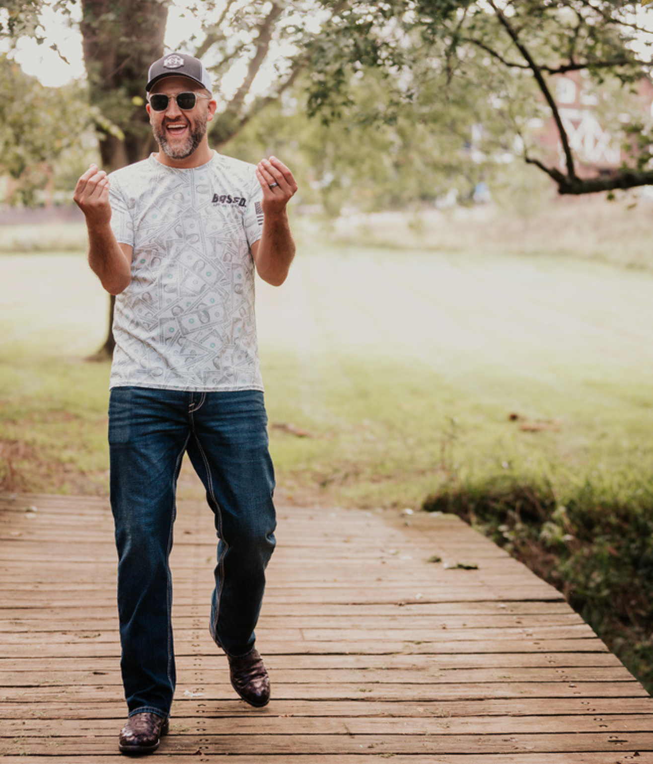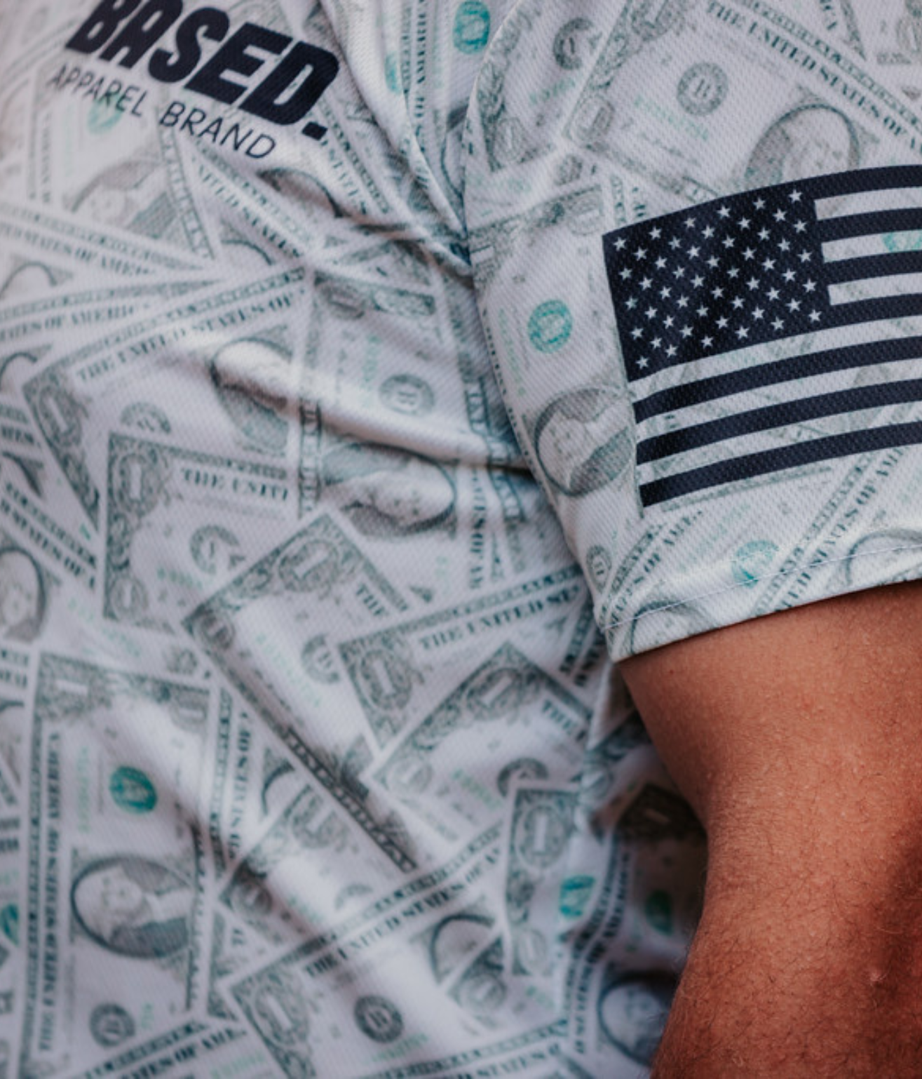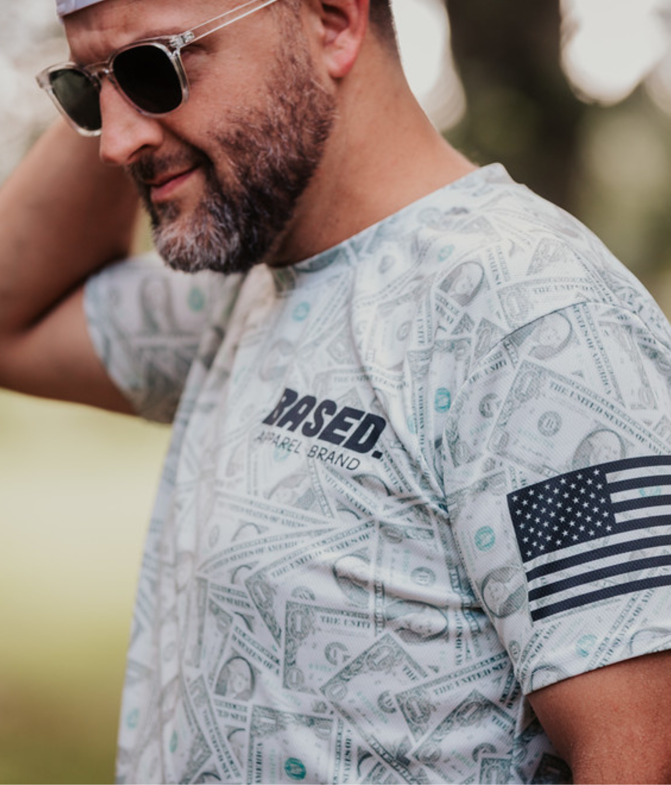 Make it rain in the George Dollar Bill T-Shirt. Features an American flag at the sleeve and the Based Apparel logo at the left chest.