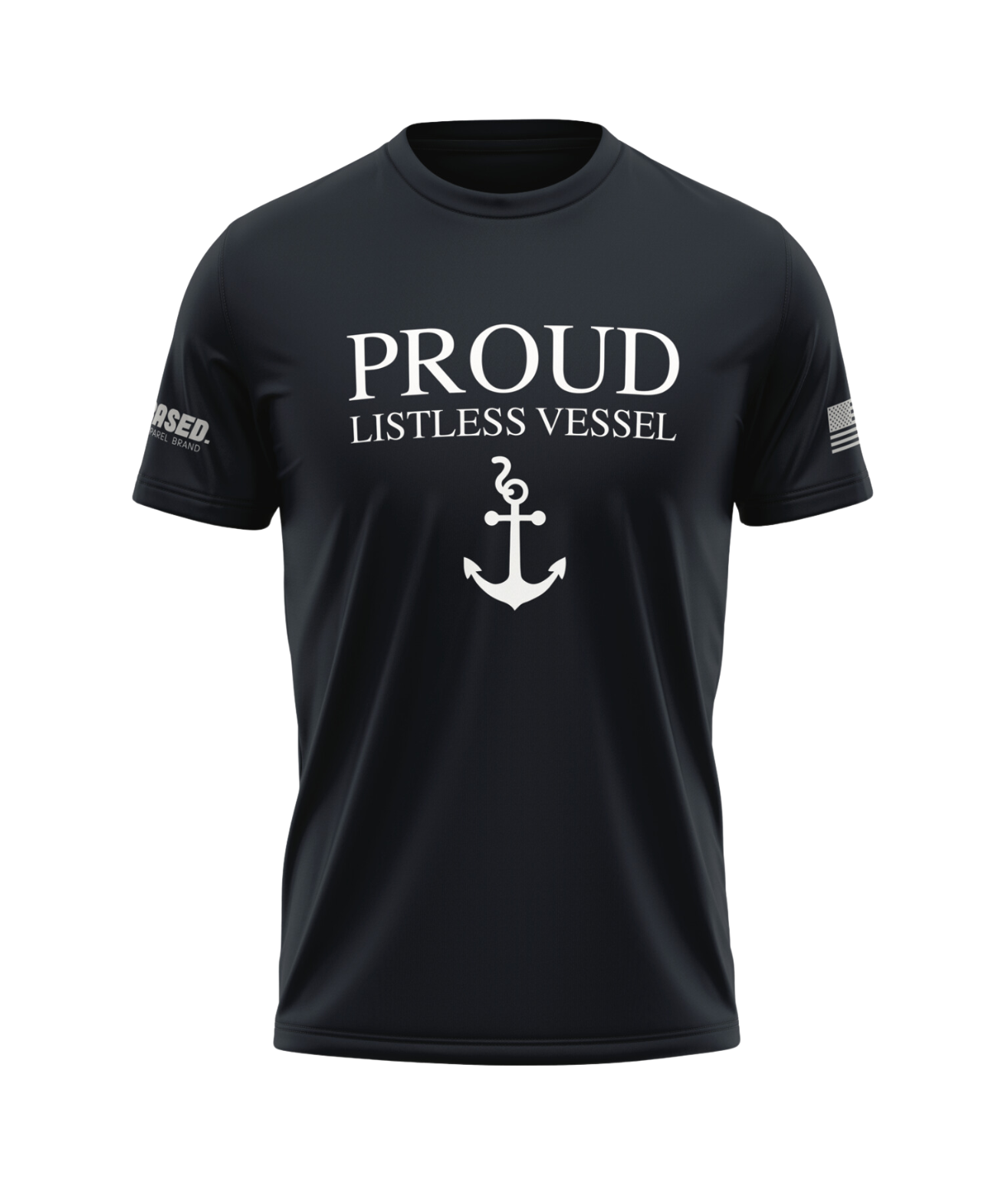 Anchors away! The Proud Listless Vessel T-Shirt features a nautical anchor at the front, a gray American flag at the left sleeve, and the Based logo at the right sleeve.