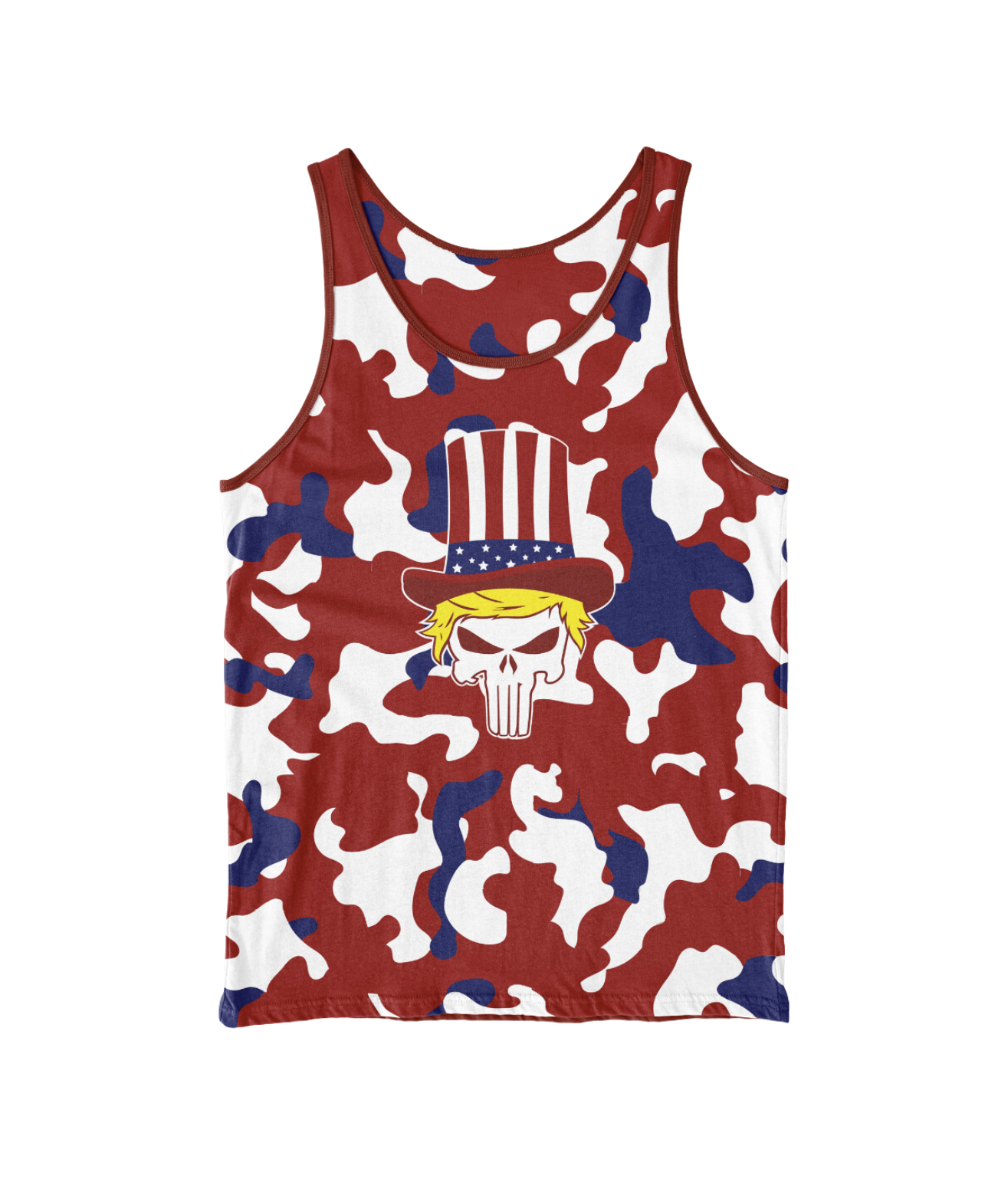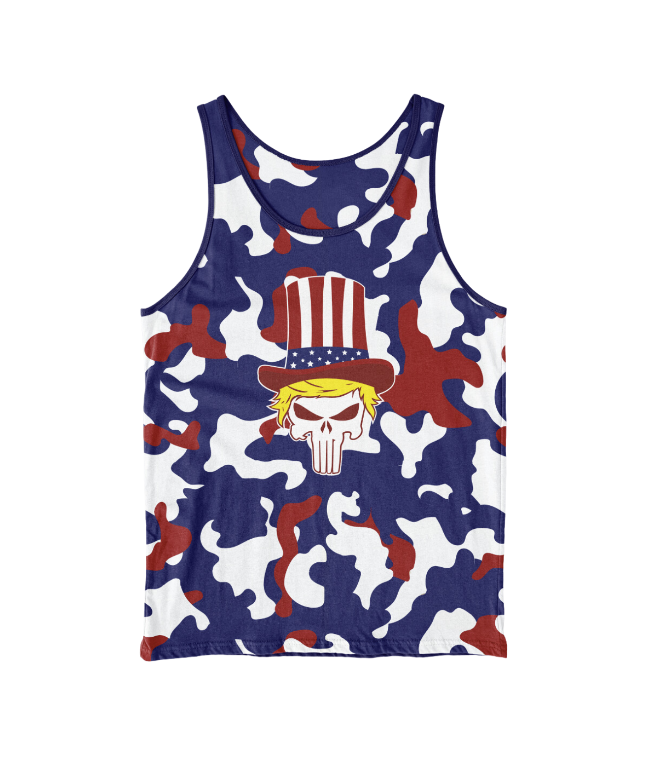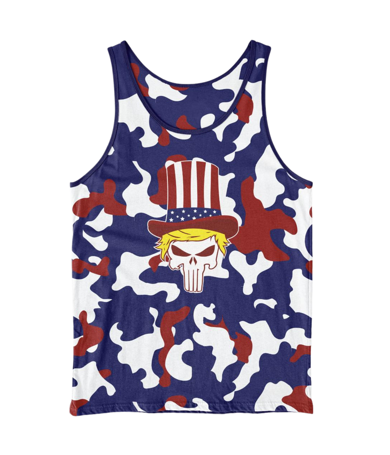 An American spin on one of your favorites: just in time for the Fourth of July. This red, white, and blue camo tank features an Uncle Sam iteration of “Orange Man Bad.”