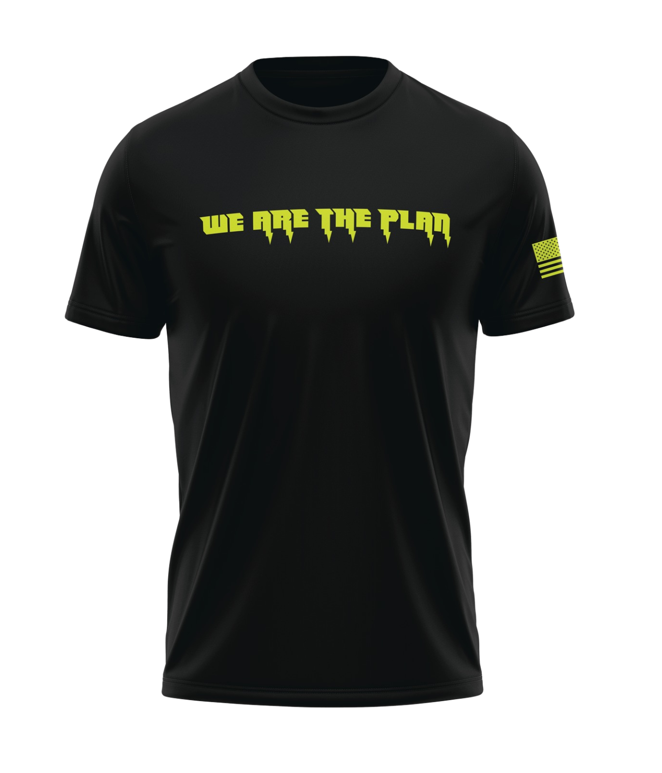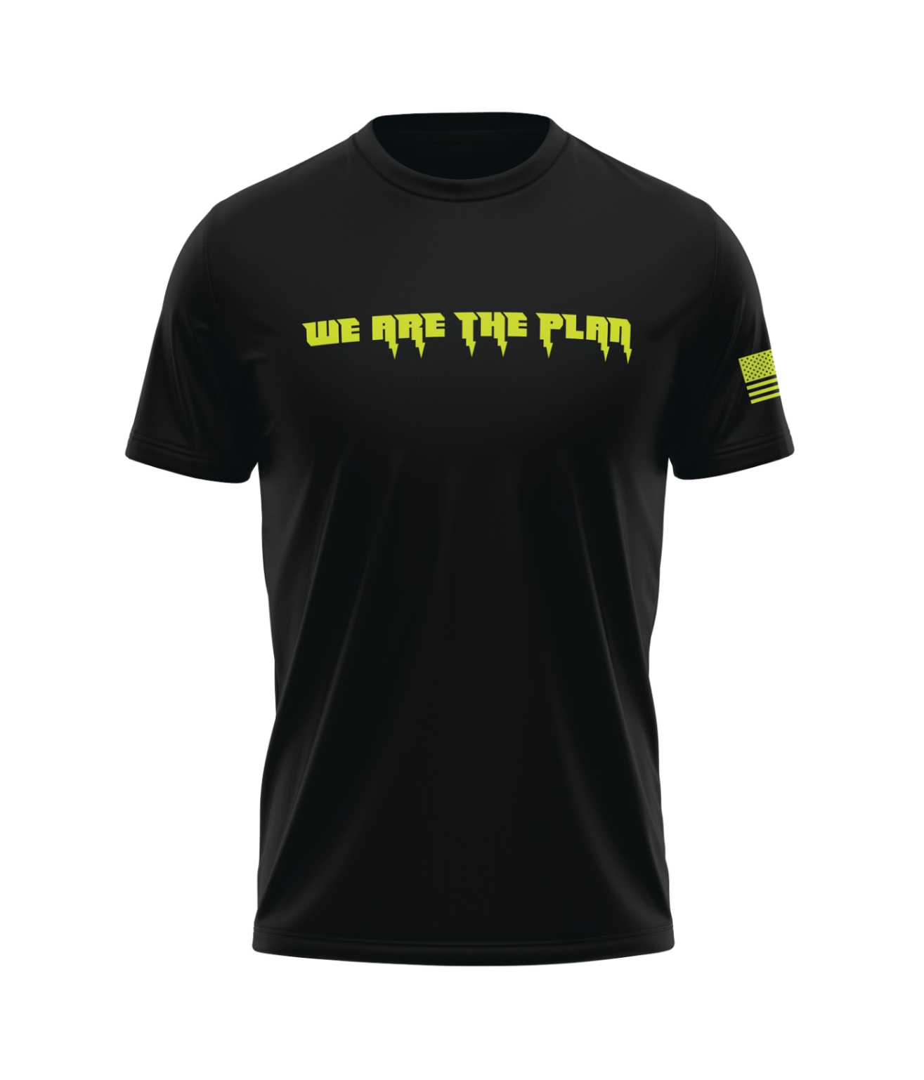What will you do for your country? The “We Are the Plan” T-Shirt features an electric neon font with lightning bolts and an American flag at the sleeve.